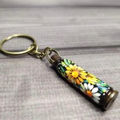 こちらは実際にウクライナ軍が戦闘で使用したNATOの機関銃の「薬莢」に、キーウに住むウクライナ人アーティストが手描きでデザインしたキーホルダーになります。