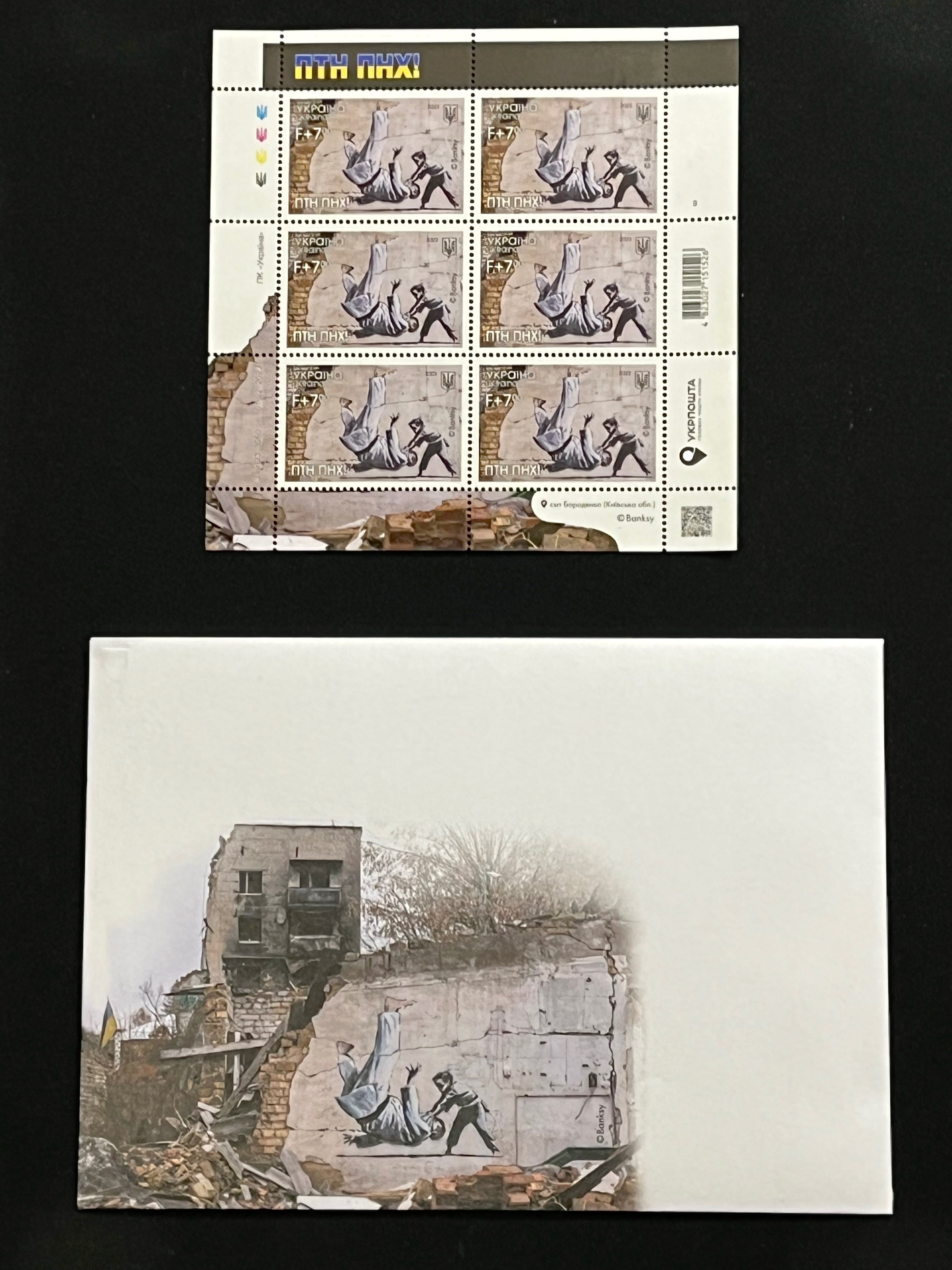 ウクライナナショナル郵便局が2023年2月24日に発行した、バンクシーが瓦礫に描いた絵をモチーフにした切手と封筒のセットです。